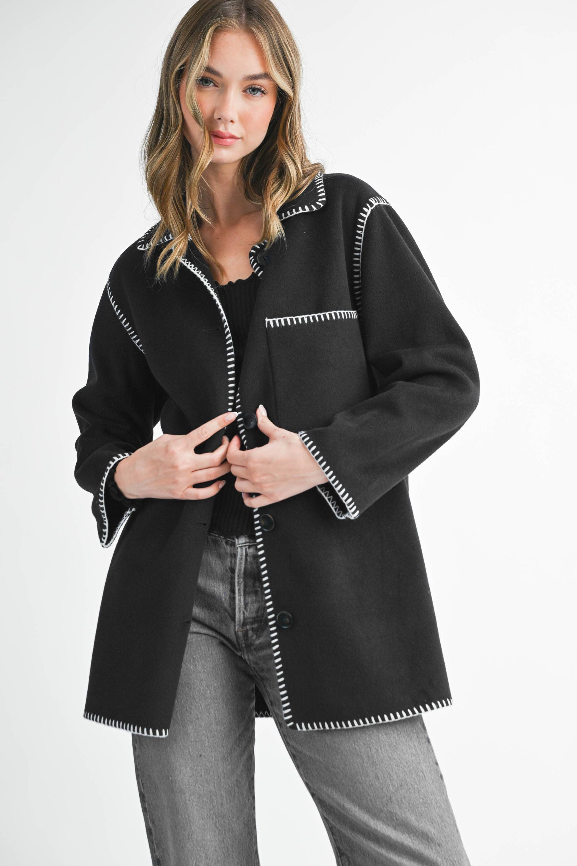 Chic and cozy collide in this structured coat, finished with bold contrast stitching and a utility chest pocket. Tailored with a boxy fit and mid-length cut—perfect for layering over your fall-to-winter favorites. Fully lined for extra warmth.