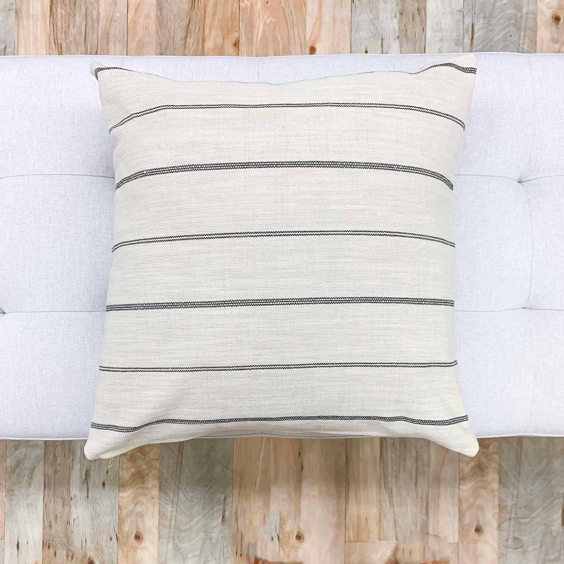 These striped pillows are truly stunning and easy to mix with other prints and elements in your home. The Pearce collection is a signature classic and comes in cream, blue and a black ombre. A stylish favorite for any season and these pillows help bring a clean feel to your space. IMPORTANT: The covers are made to fit the inserts. Eg. If you have 20x20 inserts, order 20x20 covers. Colors: cream and black. Inserts are not included. Brass zipper closure.